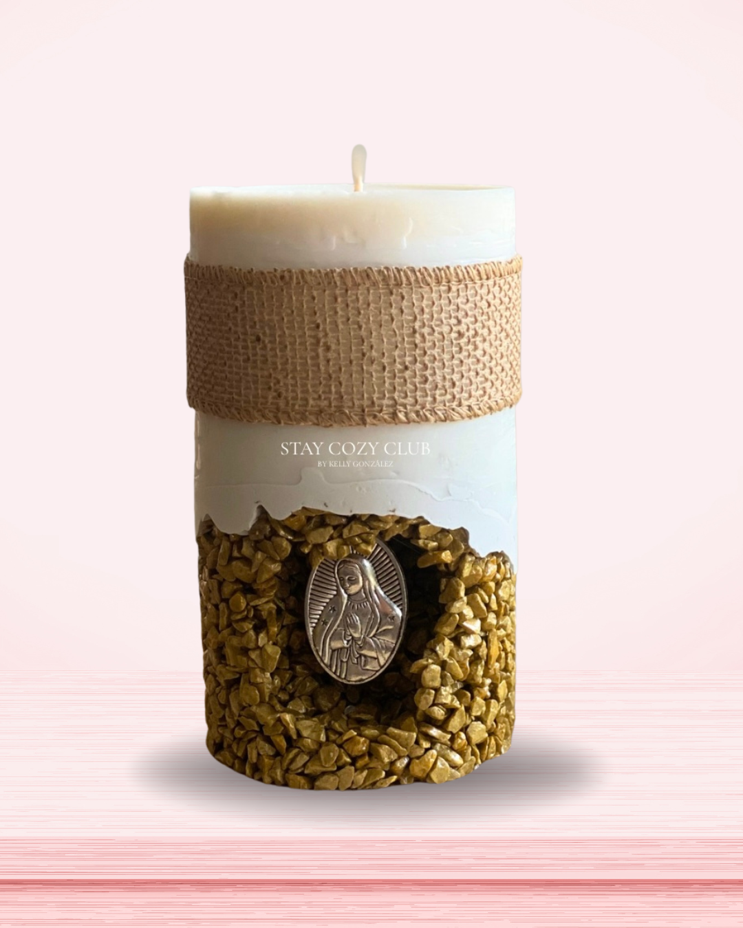 Cirio con medalla de la Virgen de Guadalupe. Aroma a lavanda. 14cm altura.